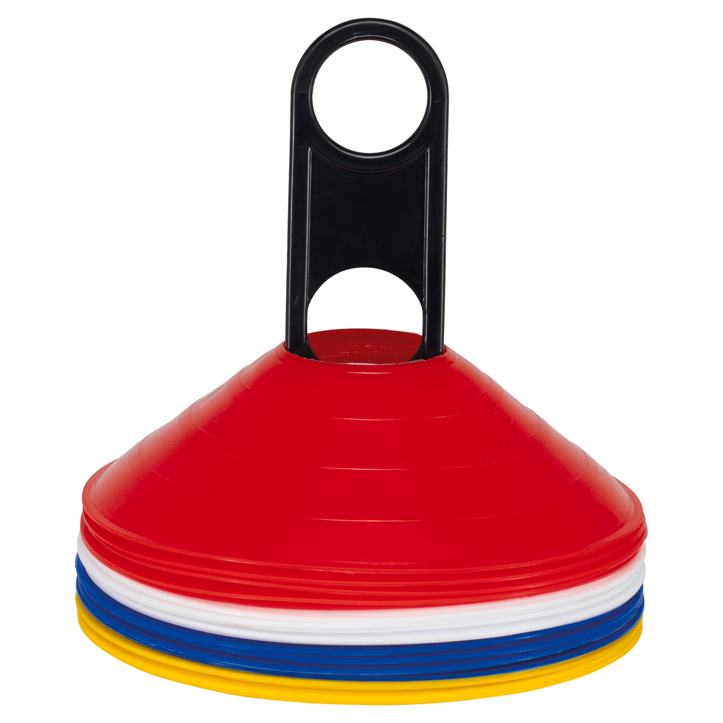 Space marker cones. Carry handle. Set contains 20 markers (5 in each colour). Height: 5 cm.